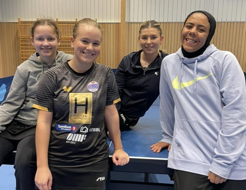 Fornøyde Kobrajenter etter første samlehelg i høst. Fra venstre sjakk- og bordtennistalentet Christine Nordahl, Kongsvingerjenta Maja Pettersen Kvinge som tok 3 gull under det seneste NM for yngre, Bodøjenta Kristina Pirtskhalava og Mariam Hussein fra Egypt.